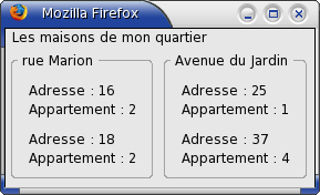 Le constructeur va boucler récursivement en utilisant le résultat obtenu comme nouveau point de départ. Pour la première rue, le nouveau point de départ sera http://www.xulplanet.com/rdf/marion. Le constructeur réapplique les règles à partir de ce nouvel emplacement dans le graphe RDF. Le nouveau noeud est un Seq RDF avec des enfants, donc les règles simplifiées peuvent générer quelques résultats. Cependant, ces résultats sont des maisons qui correspondront à la première règle. Ils correspondront également à la seconde règle puisqu'elle n'a pas de conditions, mais comme la première règle est prioritaire sur la seconde, ces règles ne seront jamais appliquées. Il en résulte que le contenu de la première règle sera utilisé pour chaque maison. Ce contenu est inséré à l'intérieur du contenu externe déjà généré pour les rues. En clair, le vbox et les deux libellés seront placés à l'intérieur de l'élément groupbox généré lors de la passe précédente.